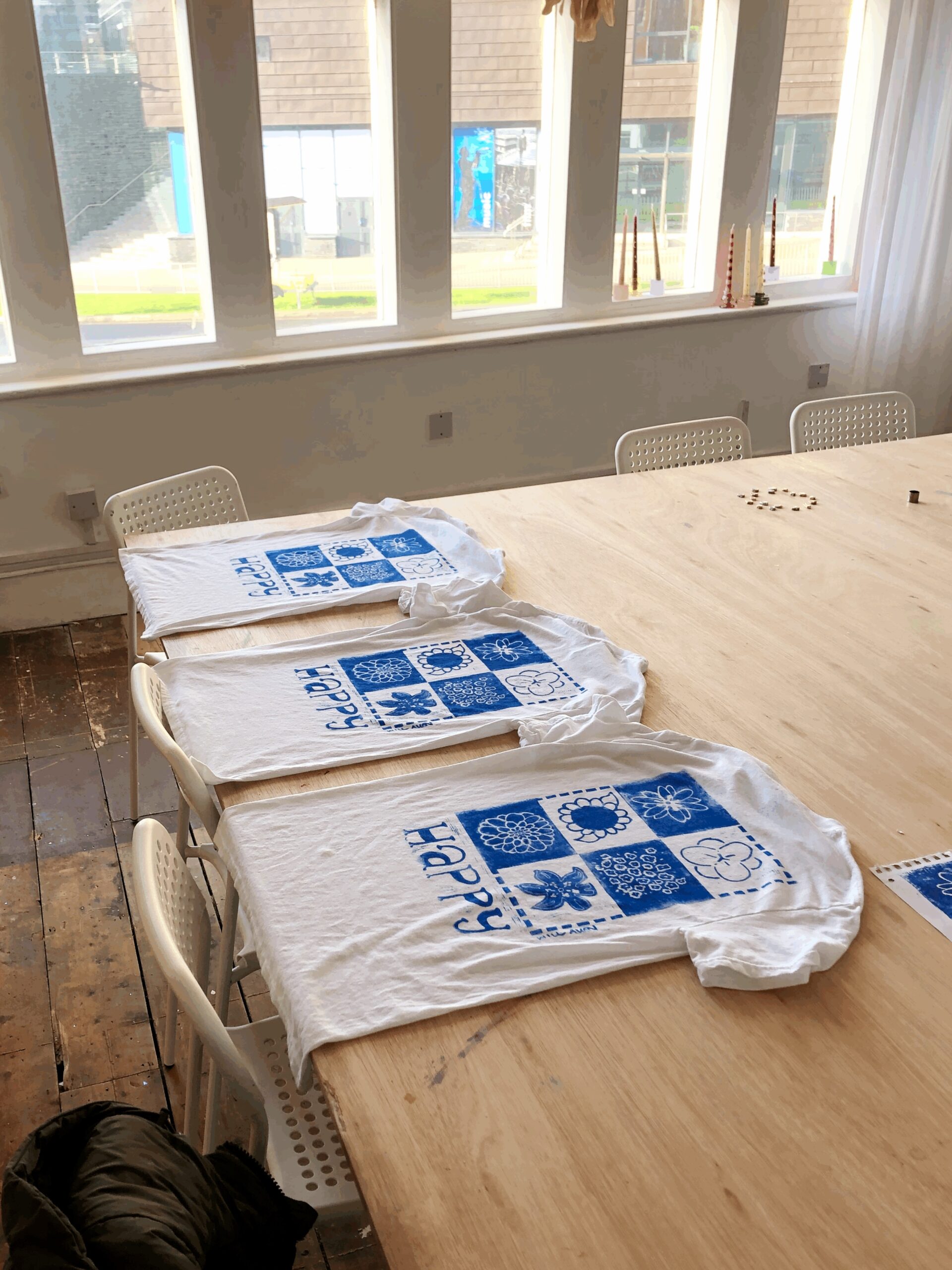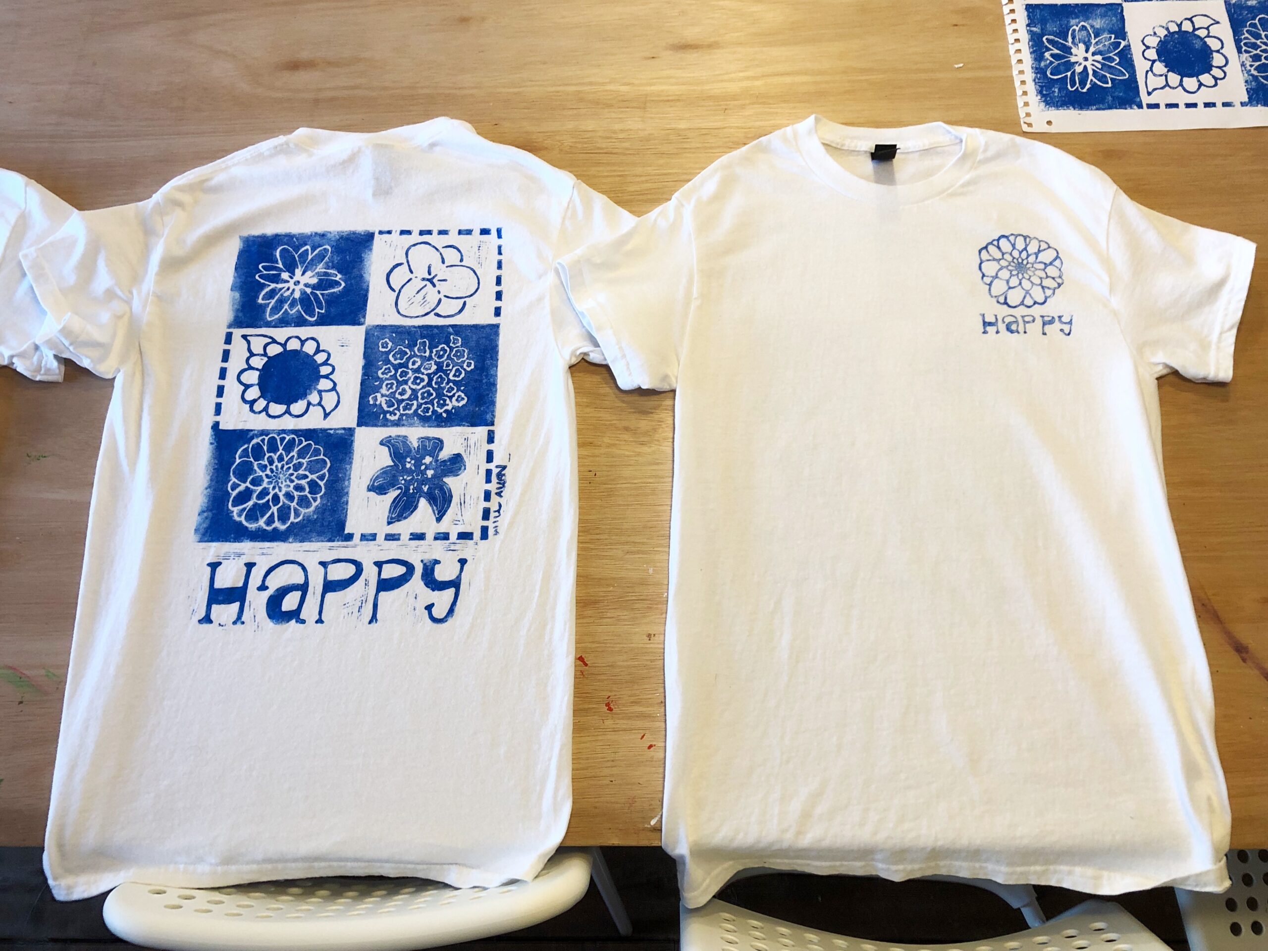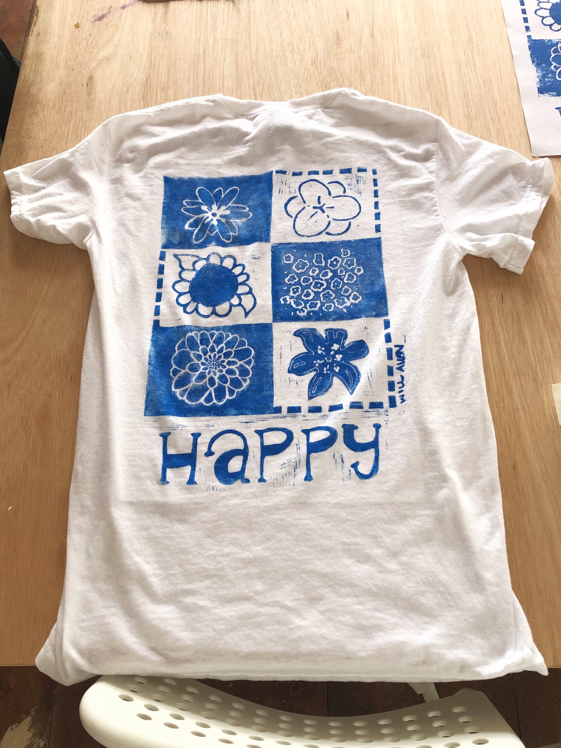 A hand-printed, custom designed T-shirt inspired by Will Allen’s song: Happy. Every print comes out differently, so your shirt will be entirely unique.